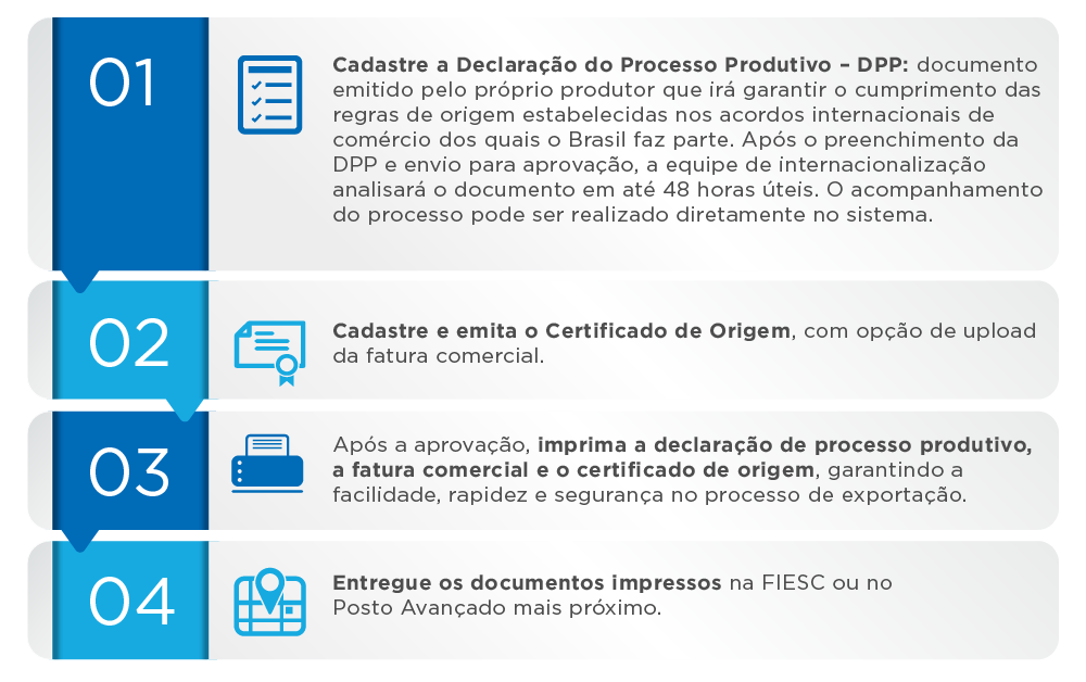 To facilitate access to the foreign market and consolidate the presence of companies from Santa Catarina on the international scene, we provide a free advisory service and guidance to companies regarding filling out producer forms and declarations, as well as tariff preferences and rules of origin.